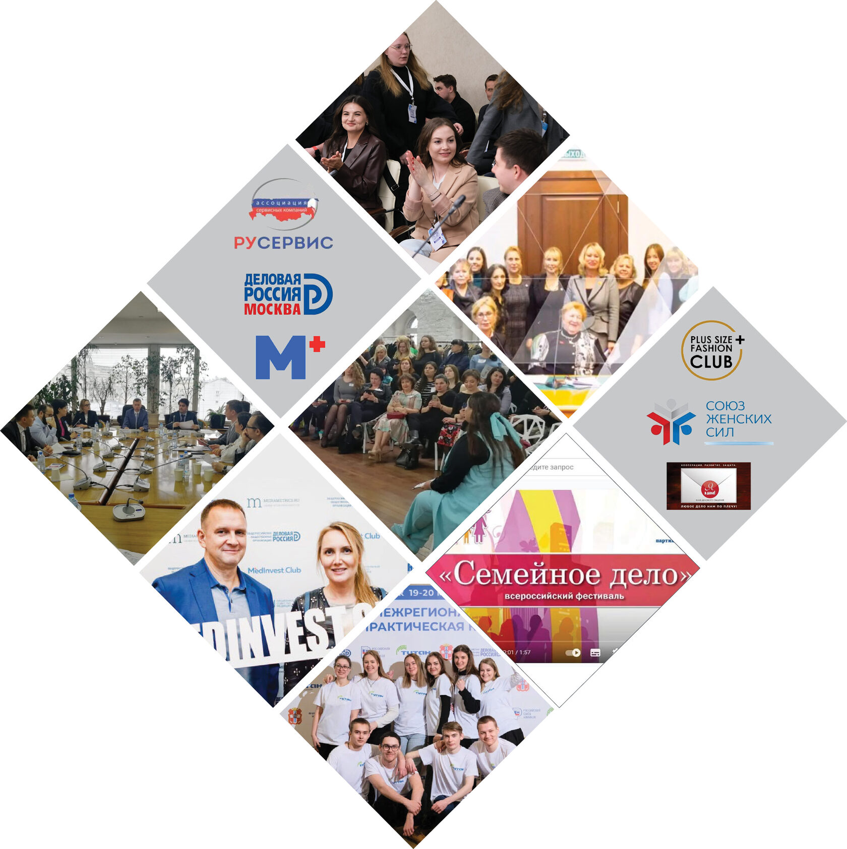 Клуб «Плюссайз» (2017 – 2019 г.) Мединвестклуб (2018 – 2019 г.) Союз женских сил (2013 – 2016 г.) Ассоциация «РУСЕРВИС» (2015 г. по н.в.) Проект «Семейное дело» (2017 г.) Совет молодых ученых Химпрома (2023 г. по н.в.)